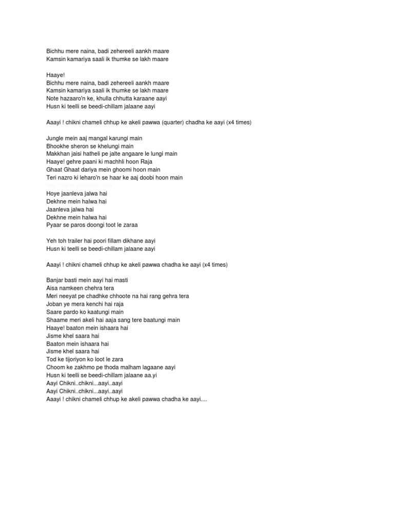 Chikni Chameli Lyrics In English - Note hazaaron ke, khulle chhutta karaane aayi. Chikni Chameli Lyrics In English - Chup ke akeli pavuoa chada ke aayi.
